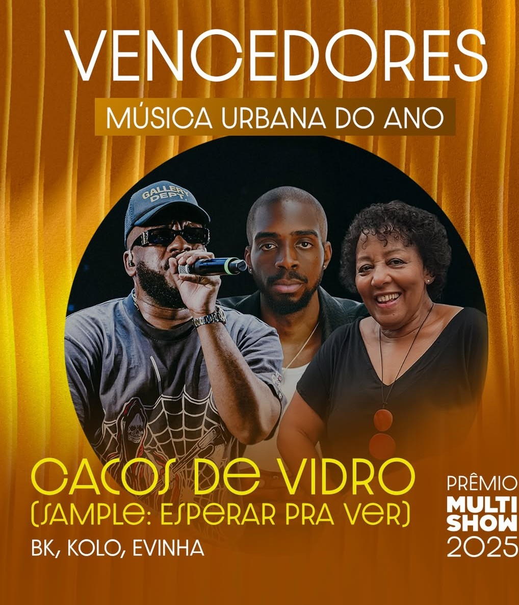 O rapper carioca BK recebeu nesta terça-feira (09/12/25) o prêmio Música Urbana do Ano, concedido pela maior premiação musical anual do país, o Prêmio Multishow. Com a track ‘Cacos de Vidro’, faixa número 14 do disco ‘Diamantes, Lágrimas & Rostos pra Esquecer (DLRE), BK reflete sobre o tema profundo dos relacionamentos humanos em um dueto com Evinha, em formato de monólogo, estabelecendo uma ponte entre gêneros e gerações distintas.